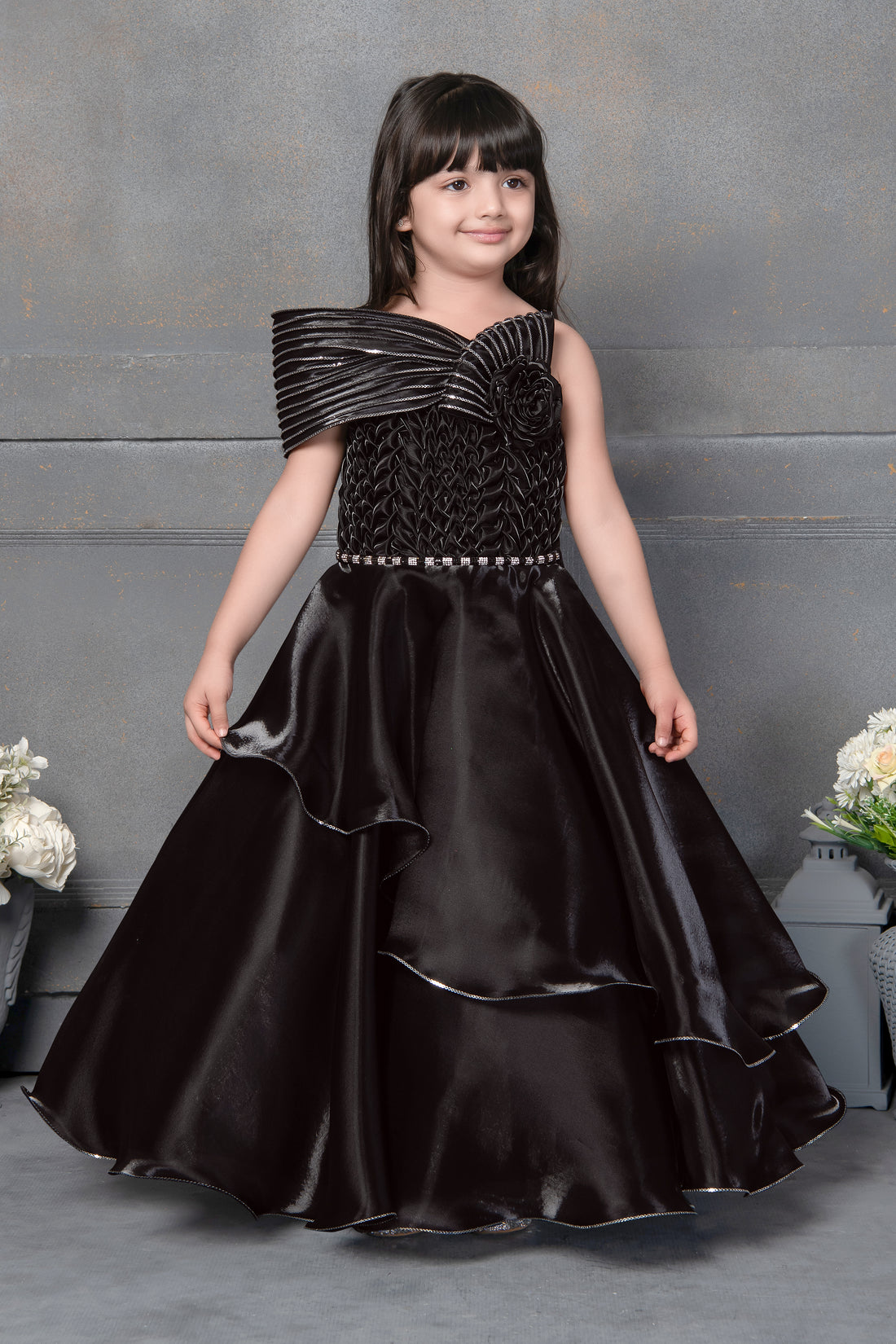 Black Satin Gown for Girls – Puff Sleeve Party Dress with Sequin Floral Applique
