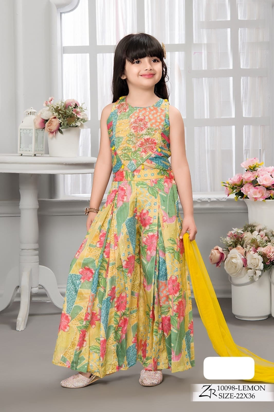 Lemon Yellow Floral Printed Gown for Girls – Sleeveless Partywear Dress with Dupatta