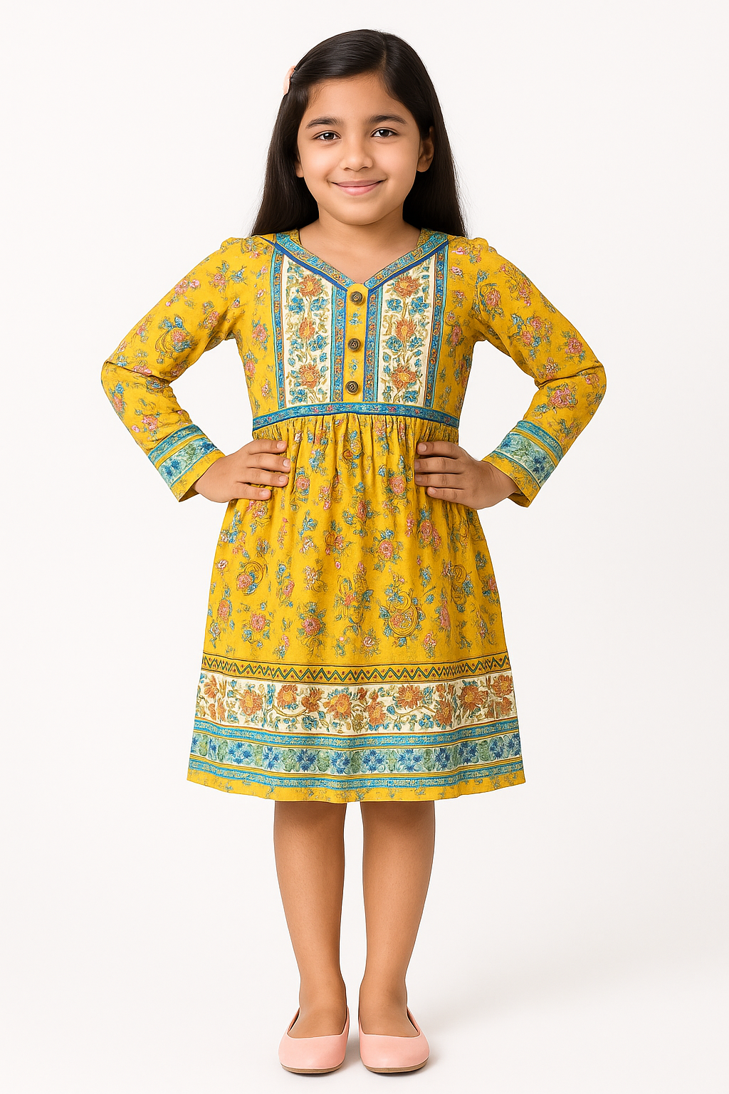 Girls Mustard Ethnic Printed Dress – Full Sleeves with Blue Border Detailing