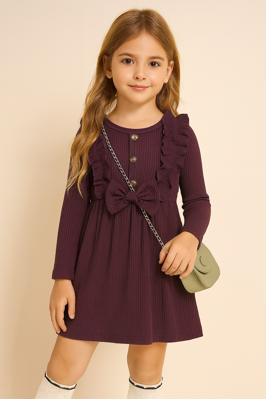Girls Ribbed Cotton Purple Dress – Long Sleeve Casual Dress with Ruffles & Bow