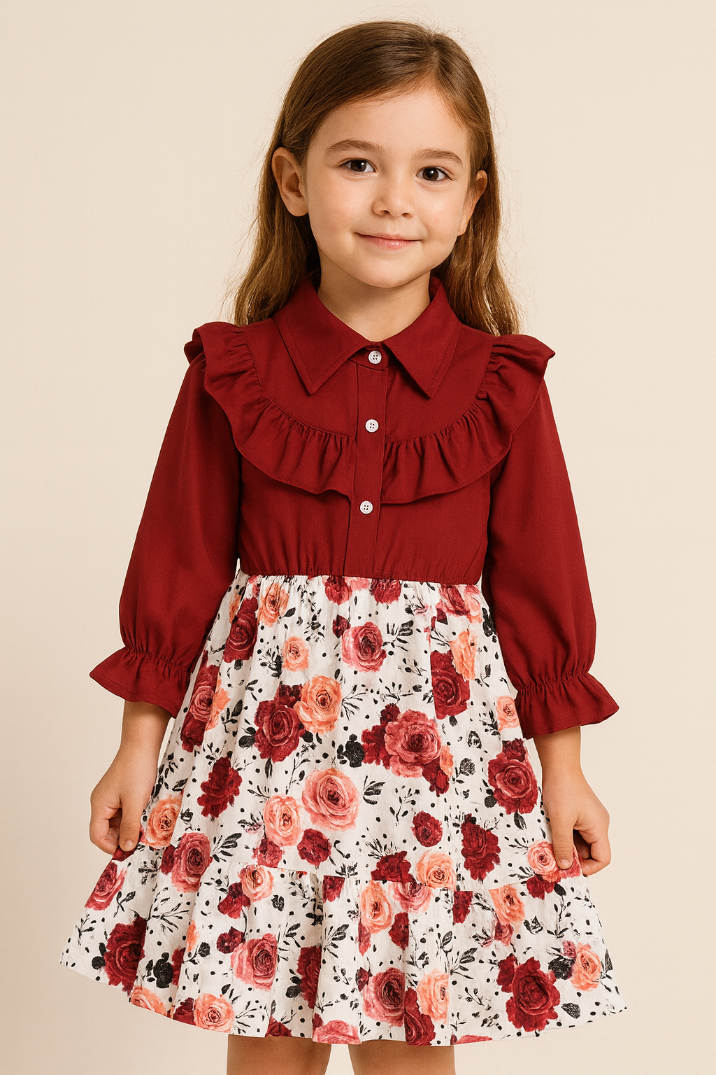 Chic Maroon & White Floral Baby Girl Dress – Full Sleeve Shirt Collar Frock with Button