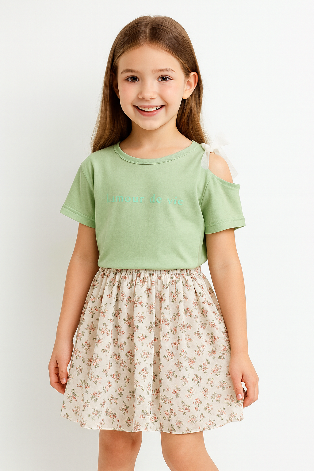 Cold Shoulder Green Top with Floral Skirt Set for Girls