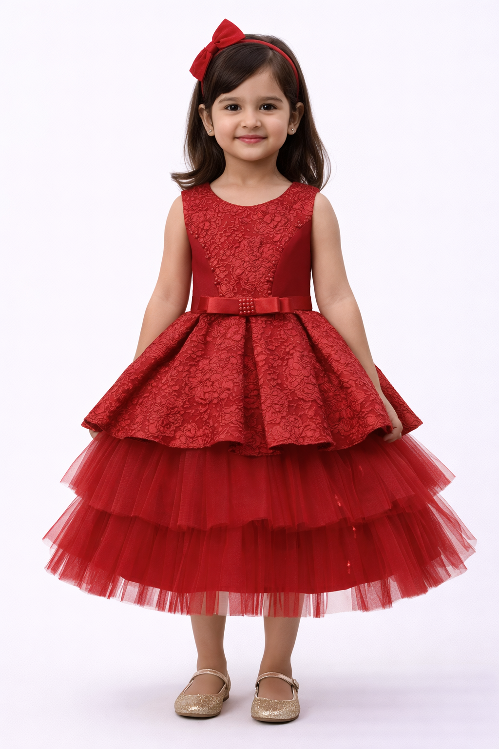 Elegant Red Layered Net & Lace Party Frock for Girls – Designer Birthday Wear