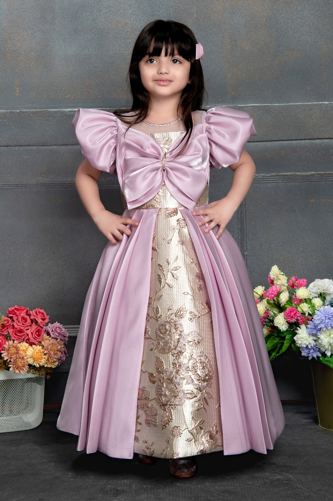 Luxury Blush Pink & Gold Designer Party Wear Gown for Girls with Oversized Bow
